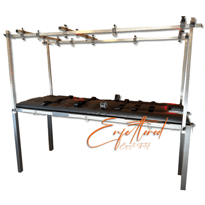 The Enfettered Aurora Bed :- Designed by a renowned UK Dominatrix Princess Aurora A flat bed with optional removable legs for transportation and installation purposes, A scooped end with the option to add Gynae legs, Stainless steel overhead gantries with movable bars and D ring points Aircraft rail and moveable points and as standard web arches on the upholstery to take even more straps should you require them….It really is all about bondage…